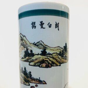 Point Blanc set of five tumblers all stamped marked. They are calligraphied are on the objects under the green borders. A set of 5 glazed celadon porcelain vases or tumblers of Taiwan Roc. Excellent condition, colorful on white background. inspiring outdoor scenery mountains, greenery, cottage, blossom red flowers, borwn stones, fisherman fishing, and green trees. They are decorative. Very likely made around 1970's when Taiwan was officially recognized as the republic of China on the export marks. Celadon is a type of ceramic with a soft grey green glaze. Each is 6" H. x 3" diam. Round shape.