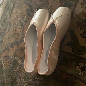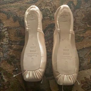 Hand made pointe shoes by Freed of London, these are designed with new technology and innovations in production techniques. Featuring a smoother line, a softer upper, and a shock absorbing layer incorporated into the block. More consistent for advanced dancers.
