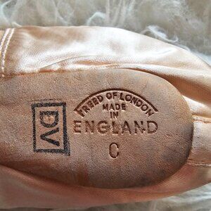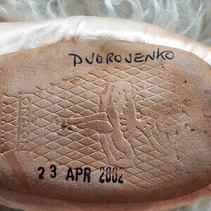 These are used pointe shoes that were danced in by Irina Dvorovenko, and after her performance, one shoe was autographed with a heavy marker.