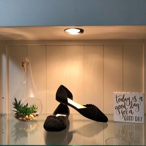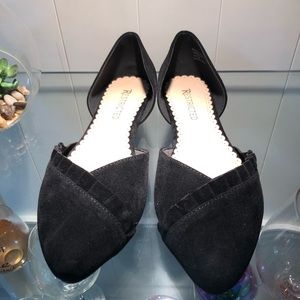 Black ballet flats with ruffle trim.