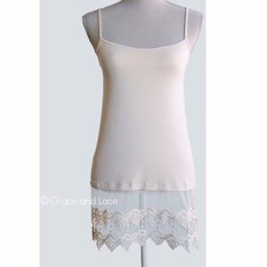 What's a top extender?? Add a little lacey length to any top, or help cute sheer tops transition from winter to spring. The Pointed Lace Top Extender creates a fun and feminine look, adding dimension to any top! Our jersey-knit cami-tank is adorned with 8" of lovely, luxe, double-layer, bobbin-knit lace. Perfect to trim out your tops with a hint of girly flair. Or, pair it with a button-down for a completely different look.