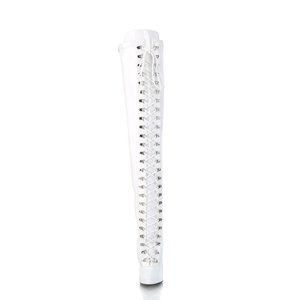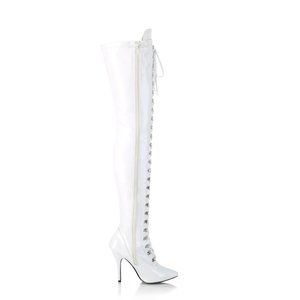 5" Heel Lace Up Pointed Toe Thigh High Boots. Full Inside Zipper Closure. Stretch White Patent.