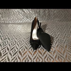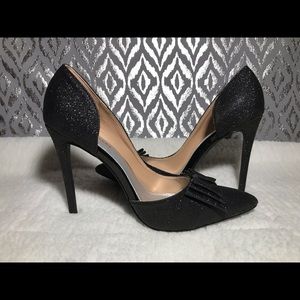 Closed stiletto heel with a glittery upper and three-tiered bow on the toe box. Heel: 4.5"