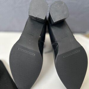 Pointed Toe Lace Up Booties, faux leather, 3 inch heel, plush soft lined inside, zipper on backside to slip them on. Size 7.5 medium. Brand is unknown. Worn once indoors so no wear on bottoms. Excellent condition. These look great with leggings or a long pencil skirt.