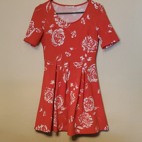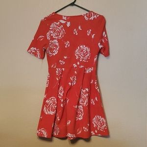 red orange dress with a floral pattern, pleated bottom and short sleeves