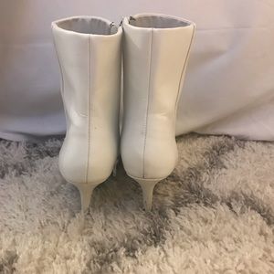 Super trendy pointed toe bootie in white. 1 inch heel. Have been worn only a handful of times. Heel is scuffed and small scuff on one toe. No trades!