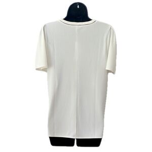 A shirt that is ready to compliment any outfit. The polyester blend has a little bit of stretch for comfort. The pointelle detail at the neck and gathered details on the shoulders make it a unique staple piece to join your wardrobe.