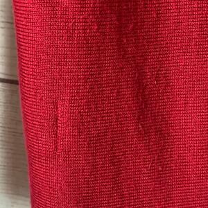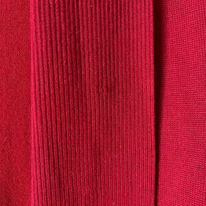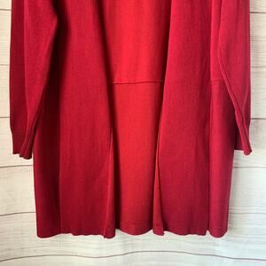 Long red cardigan sweater by Pointelle. This long sleeve cardigan has a ribbed folded open neckline and a horizontal seam that wraps around the middle of the cardigan. It is pre-owned, with a snag on the back right shoulder, bottom right hip, a small dark lin on the back right hip, and a snag on the front fold.