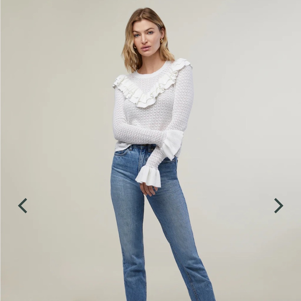 Pointelle stitchwork joins fine ribbing on this cotton-wool sweater. It’s adorned with a ruffled front yoke, a detail mirrored by the flounce-edged sleeves.
