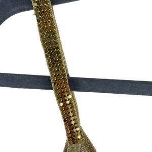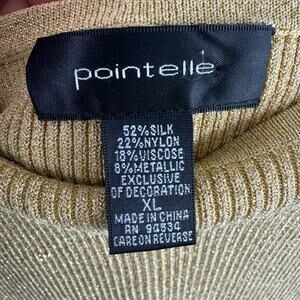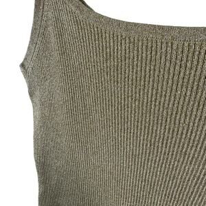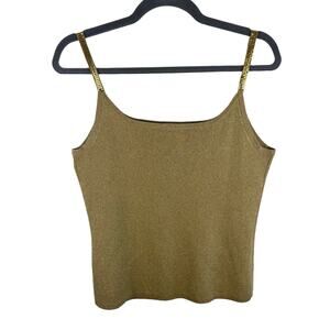 Excellent preowned condition. Gold shimmery ribbed knit spaghetti strap tank top. Straps have gold studding. Top has stretch. Silk/viscose/nylon/metallic material. Approx. measurements: Shoulder to hem 23", pit to pit 17". Size XL.