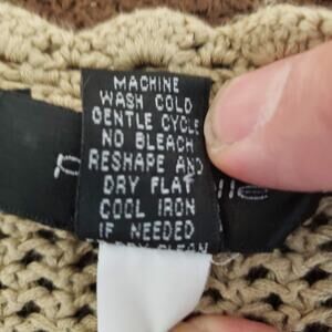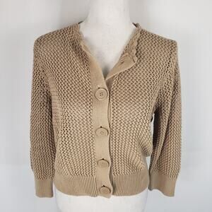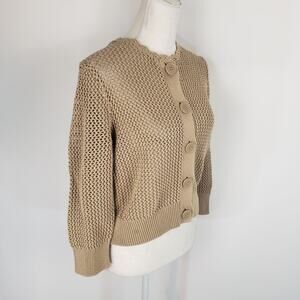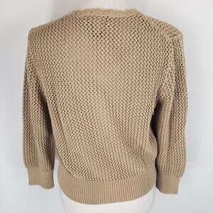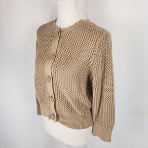 Pointelle Tan Button Up Open Mesh Knit Long Sleeve Crochet Neck Crop Cardigan XL