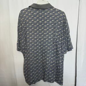 Step into retro style with this Points West men's polo shirt, size Large, made in Turkey from 100% cotton. This unique short sleeve shirt features a textured knit and an all-over golf-themed pattern including clubs, golf balls, and tees, set against a navy and beige background. The contrasting gray ribbed collar adds a vintage flair perfect for golf enthusiasts or lovers of quirky patterned polos. In excellent pre-owned condition with no stains, holes, or major signs of wear. A true standout piece for any wardrobe or collection.