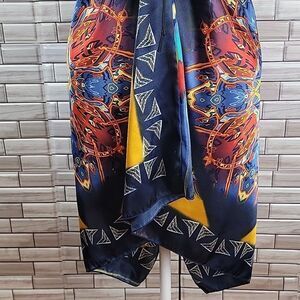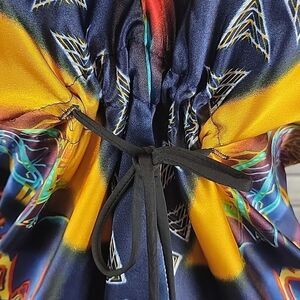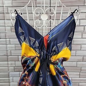 100% polyester vibrant colored Starburst print in this pullover design midi dress. Spaghetti straps to a v neck and a ribbon detail that can be pulled to gather at the bustline. Great pre-owned condition. This dress seems to run small for a large.