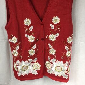 Red knit vest. White & gold Poinsettias embroidered and embellished. White beads. Size Large. One Resource brand.