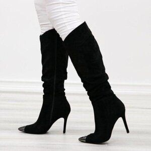 Pointy Toe Below The Knee Black Boots Faux Suede