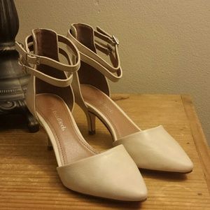 Step out in flirty, feminine style with a pointy toe pump with a kitten heel. Vegan leather pumps have a double ankle strap with a buckle and velcro closure on the side. Run small