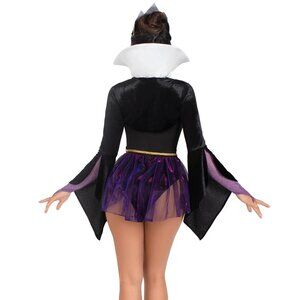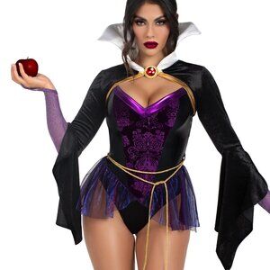 Channel your inner villainess in the 4 PC Poison Apple Queen costume This evil queen costume includes a snap crotch bodysuit with velvet brocade detail and iridescent skirt, velvet shrug with jewel closure and gauntlet sleeve, gold rope belt, and crown.