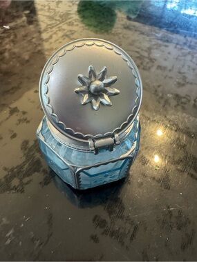 Charming blue decorative trinket box with a silver-tone lid. The box features a small figurine inside and a faceted blue exterior. This blue piece adds a delicate accent to any room. Brings a whimsical touch to your decor.