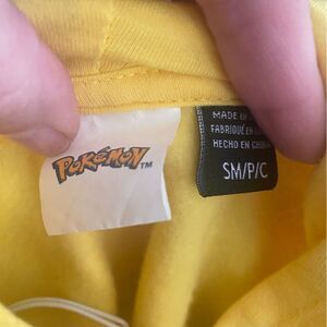 Boy's Pokemon costume hoodie is a zip-up jacket with 2 side pockets and a soft fleece inner lining. Hood has Pikachu's face and ears. Additional graphics on back. In yellow. 59% Cotton/41% Polyester. Machine washable. Imported. Like new, excellent condition