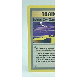 This rare Vintage 2000 Pokémon TCG card is a must-have for any serious collector. The Saffron City Gym Trainer-Stadium card from the Gym Challenge set is in Near Mint or better condition, and features the beautiful artwork of Keiji Kinebuchi.