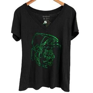 Rare Pokemon Center Exclusive Mega Rayquaza Eclipse V-Neck T-Shirt. Black heather tri-blend fabric with emerald green metallic line art graphic of Mega Rayquaza on front and “#384” on back neck. Soft lightweight feel. Brand new with tags.