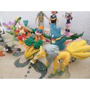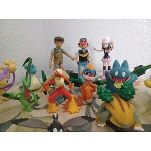 The "Pokemon Diamond & Pearl Ash, Dawn, Brock Figures Jakks Pacific + 11 Figurin lot" includes action figures of the characters Ash, Dawn, and Brock from the Pokémon franchise, specifically from the Diamond & Pearl series. Manufactured by JAKKS Pacific , these plastic figures are part of a set + 11 .The theme of these exclusive action figures revolves around the popular anime and manga series, making them a valuable addition to any Pokémon fan's collection.