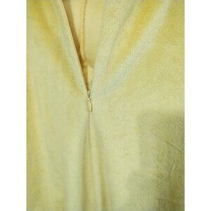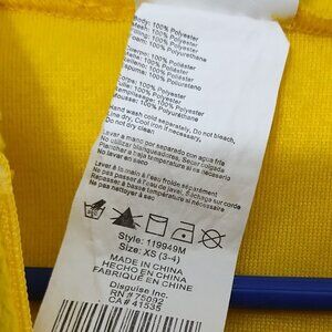 Polyester, measurements are 17" pit to pit, 40" length, 20" sleeve, zipper works, soft, leg openings go over shoes (some wear and tear on the inside of those, but not visible), little bit of staining on back tail, but otherwise in great condition, good quality, super cute