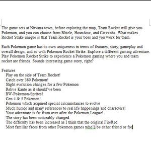 Pokemon Rocket Science and Rocket Strike, 2 amazing games from the perspective of Team Rocket! Rocket Science Storyline After your grueling defeat at SILPH CO. your boss, Giovanni, calls you (and all the other scientists that were fired after that failure) in for a meeting at his gym in Viridian City. You are all put under new management and given the task of creating more powerful Pokemon. While most of your team is in a lab actually creating these “powerful POKEMON” you are tasked with field work. Your new job is to run missions, test experiments and help Team Rocket succeed in their mission. You may be loaned out to help with other Team Rocket missions. You may get to test out these “powerful Pokemon” before Giovanni gets his hands on them. You will definitely see the damage caused to Team Rocket by a certain young hero. See Kanto from a whole new perspective. Enjoy the dark side. Features Play a Pokemon game from a Team Rocket Scientists’s viewpoint. Being a criminal is not too bad sometimes. Rocket Strike description is the last picture. If you have any questions, please let me know! Thanks for checking out my listing.