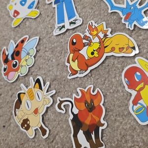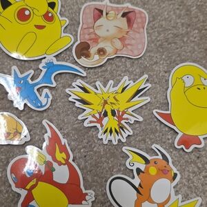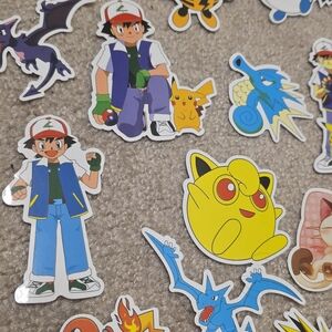 Pokemon stickers featuring Pikachu, Ash Ketchum, Meowth, Psyduck, Charmander, Raichu, and more!