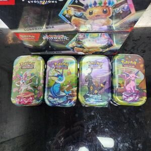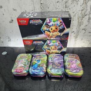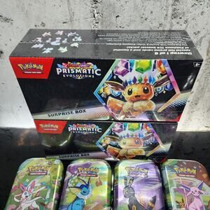Pokemon TCG Prismatic Evolutions Surprise Box and Tins Combo Bundle Lot