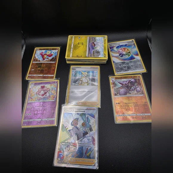 Collection of Pokemon trading cards featuring various characters and designs. Includes vibrant colors and unique artwork.