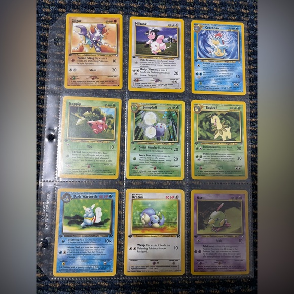 Collection of Pokemon trading cards featuring various characters. Vibrant yellow borders with colorful illustrations.