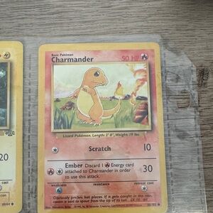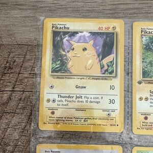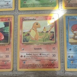 Set of nine Pokemon trading cards featuring Pikachu, 1st Edition Pikachu Charmander, Eevee, Bulbasaur, Rhyhorn, Charmeleon, and Krabby. Vibrant colors and classic designs.