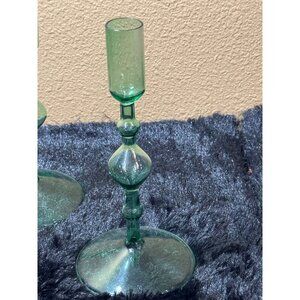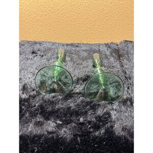 This set of vintage green glass candle holders showcases an elegant design with a unique silhouette.