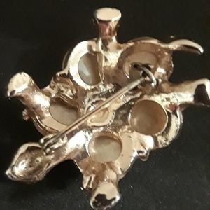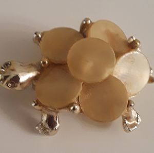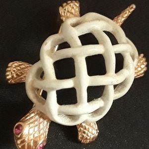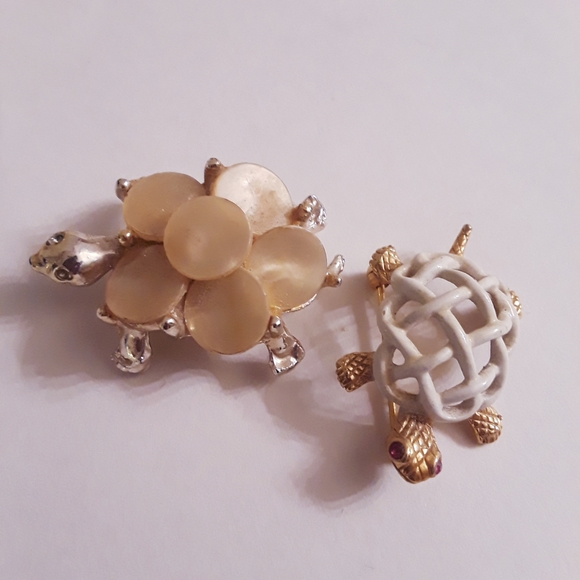 Two turtle brooches that will charm the aquatic nature in just about anyone. (How can you not be fascinated by these slow-moving creatures?) The larger turtle has a silver finish while the smaller is set in gold. The small one has tiny stone-set red eyes. Large = 1/2" x 1-1/8”; Small = 1=1/4” x 3/4". Both are in Excellent Condition.