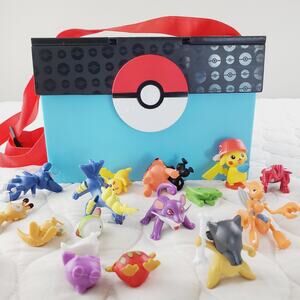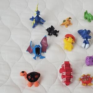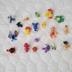 This product is a bulk lot of 19 colorful mini Pokemon figures, including characters like Pikachu. These collectible toys are made of plastic and are licensed reproductions from the Nintendo franchise. The figures are designed in a 1:9 scale and are part of the animated adventures series, perfect for fans of the Pokemon TV show. Each figure varies in length and width, as shown in the photos. Ideal for children ages 8-11 years, these miniature action figures are a must-have for any Pokemon enthusiast looking to add to their collection.