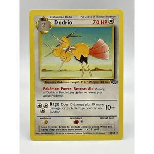 This Pokémon TCG Dodrio card from the Jungle set is a must-have for any collector. The Colorless card was illustrated by Mitsuhiro Arita and features an HP of 70. This card is from the Unlimited series and is a non-holo, Uncommon rarity. The card is in near mint or better condition and was manufactured in 1999, making it a vintage piece. The card number is 34/64 and has a regular finish. Add this rare gem to your collection today!