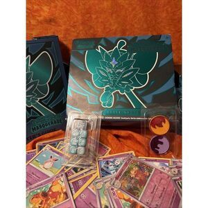 The Pokémon Twilight Masquerade Elite Trainer Box includes Scarlet & Violet cards, a handbook, and is part of the 2024 set. It features standard-sized cards in English and is produced by The Pokemon Company International. The box is designed for the Pokemon Trading Card Game and is suitable for ages 6 and up. Made in the USA.