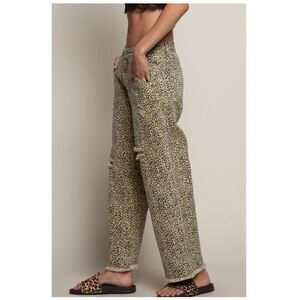 We are in love with leopard prints so we decided to make wide straight leopard printed denim jeans. Designed with a relaxed fit with button and zipper closure, belt loop on belt waist, distressed detailing on the body with pockets on the sides & back, and finished with raw edge on hem.