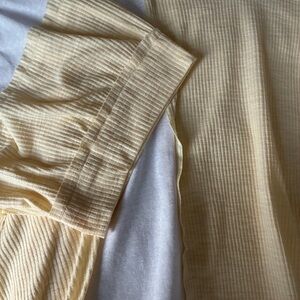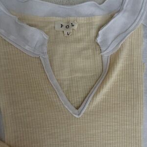 Effortless, cozy style from POL. This oversized colorblock top features a soft ribbed knit front in a pale yellow tone with contrasting white panels for a relaxed, lived-in look. Designed with a flattering V-neckline, raw-edge details, and wide short sleeves, it’s perfect for casual everyday wear.