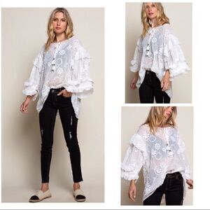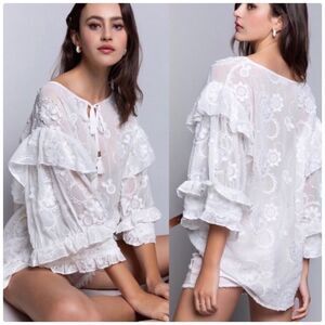 A great brunch outing top to wear in our embrodiered floral woven top. Designed with a relaxed boxy fit , round boat neckline with self ribbon tassel tie on the front, 3/4" wide sleeve with ruffle detailing and finished with clean hem.
