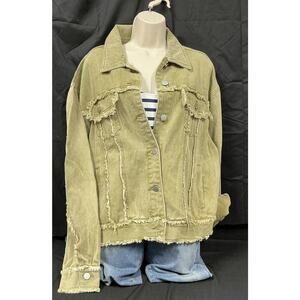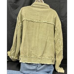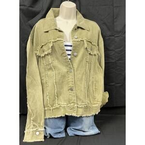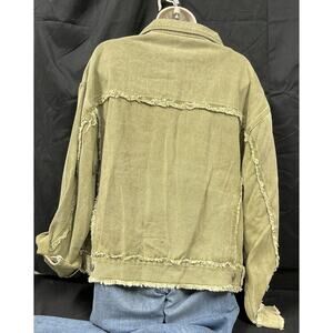Pol Women's Trucker Style Army Green Button Up Oversized Shacket with Fraying in size small.