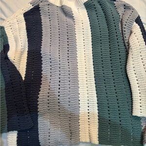 Cozy knit sweater with a V-neck design. Features stripes in blue, green, gray, and cream