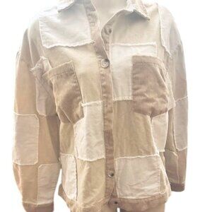 This oversized patchwork jacket offers a blend of soft corduroy and cotton, featuring a button-up design and neutral tones suitable for layering. Two chest pockets in corduroy and Collar with corduroy detailing
