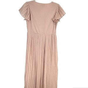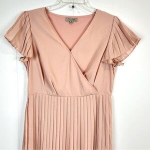 Polagram blush pink full-length gown with a pleated skirt and surplice V-neckline. Features flutter sleeves, an empire waist, and a flowing maxi silhouette. Perfect for weddings, bridesmaids, proms, or special evening occasions.
