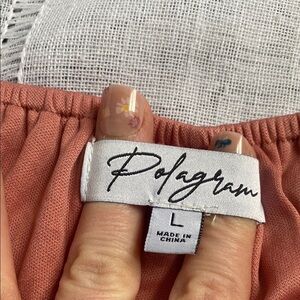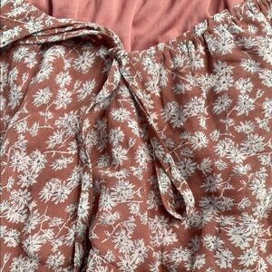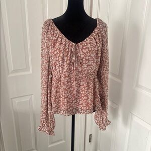 Polagram Peasant Floral Blouse with Sweetheart Neckline. Size large. Lined. Feminine tucking below the breast-line to accent feminine curves. Soft dusty rose with white and gray wildflower print. Flowing. Ruffled cuffs. Romantic and bohemian. Can be worn on or off the shoulders. Beautiful condition. Style with your favorite denim!