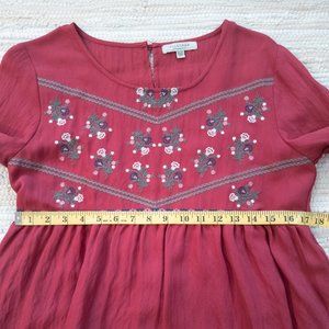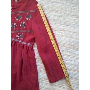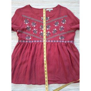 Adorable boho, folk inspired vibrant red peplum top from Polagram in a size M. Floral embroidery design. Long sleeves, waist seam sits high, like an empire waist. Button keyhole opening at back neckline. In great used condition, not stains or holes. Only issue is button thread at back closure is starting to come loose, will probably need to reinforce. Would probably recommend this more to someone who is a size S or size 4/6. I wore it when I was a size 8 and it fit, but it didn't have much ease. Colors may appear duller in photos, but the red in person is rich and bright. Measurements, materials and care instructions in photos. From a smoke free, cat and dog friendly home.