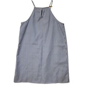 Features: keyhole in back with button closure, embroidered applique, blue & white stiped, mini length, spaghetti straps, square neckline