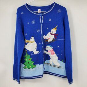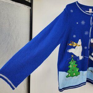 Polar Bear Christmas Y2K Cottage Skiing Graphic Button Up Cardigan Sweater Large