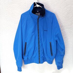 Nice cobalt blue fleece lined jacket with the word Boeing embroidered on the left chest. The outer is dacron polyester and the inside is fleece in black. The pockets are zippered and the front zips all the way up to the chin to keep out the cold.
